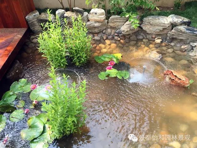 庭院中設計靜水池,水池中可放養魚龜,兼種荷花、睡蓮、水生鳶尾等