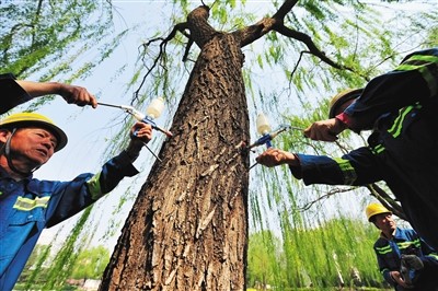 目前,北京治理方式主要為“打針”、高位嫁接、修剪、噴水等。修剪、噴水等方式為臨時性抑制措施;“高接換頭術”是指雄性柳樹枝條部分嫁接到雌性柳樹的樹干上,相當于給柳樹做了一個“變性手術”,讓其不再飄絮。